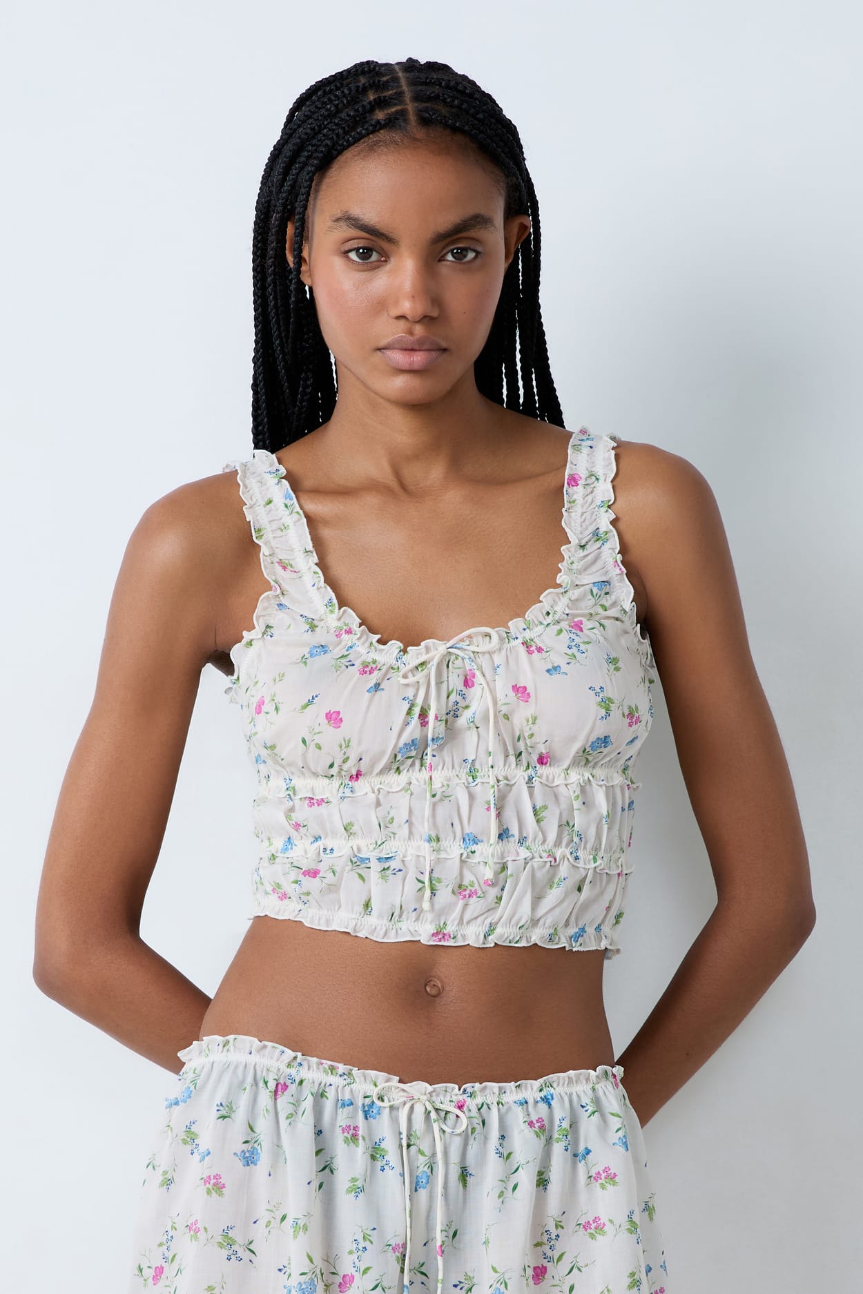 Spring is in the air with this top adorned with a floral print. This piece focuses on delicacy with its gathers and front bow. Its fluid and light cut enhances the silhouette.