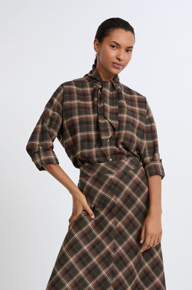 • Shirt • Tie collar • Long sleeves • Checkered print • Fluid cut • Majority cotton