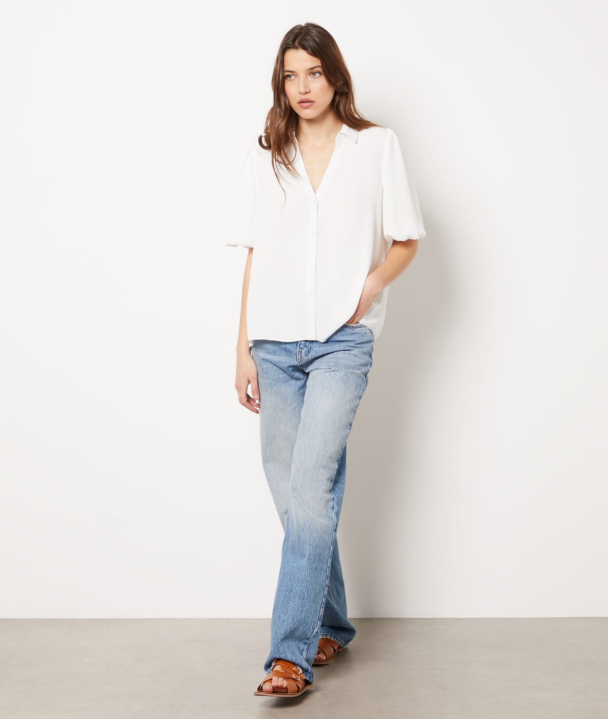 This blouse with short puffed sleeves is a classic must-have for your wardrobe. Featuring a shirt collar, the neckline f...