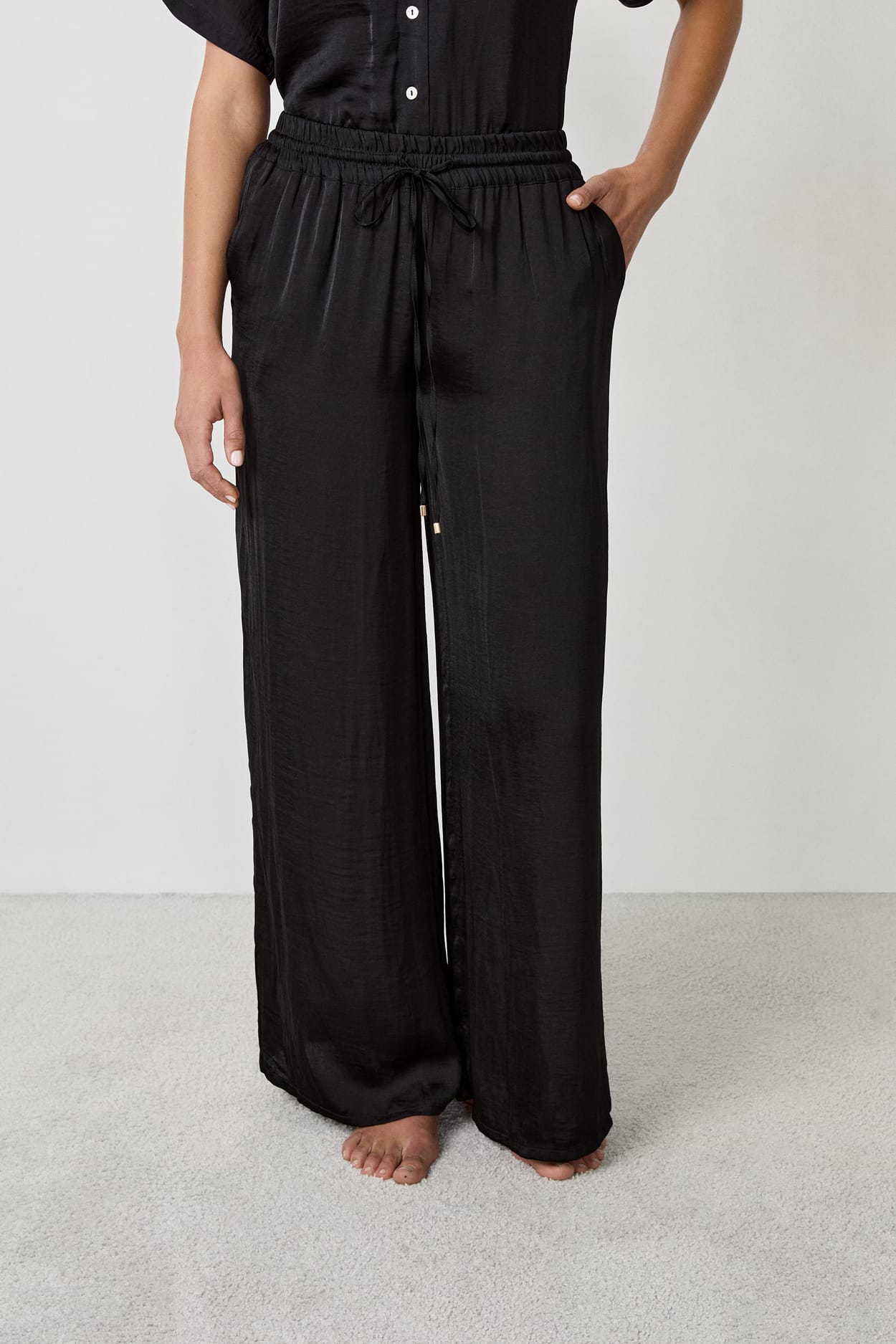 Wide and delicately satin, these gathered trousers offer perfect comfort and very soft nights. Add the coordinating cami...