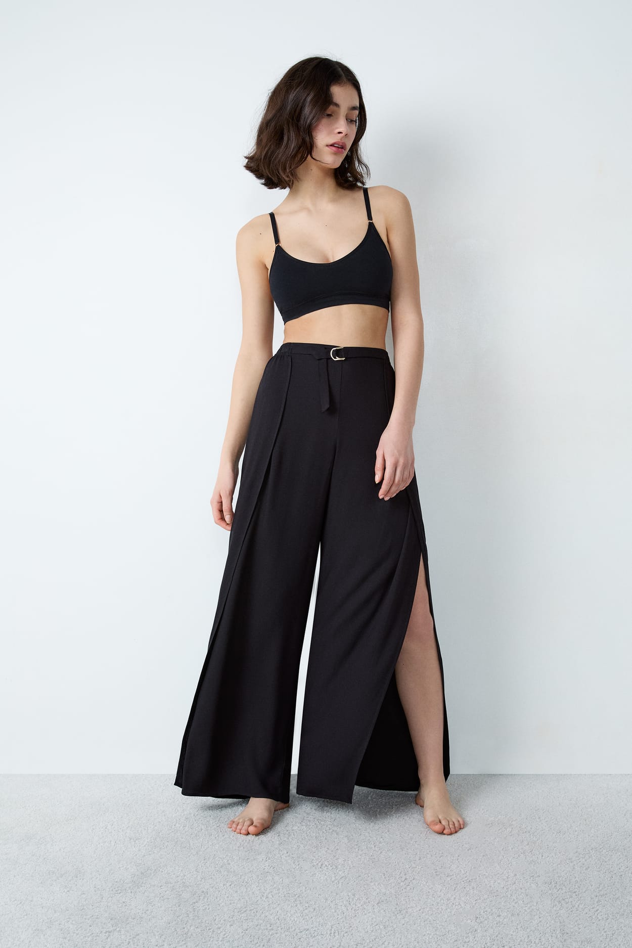 A key piece of the season, these trousers subtly reveal the legs thanks to their side slits. With a fluid cut and an integrated belt, they elegantly enhance the silhouette.